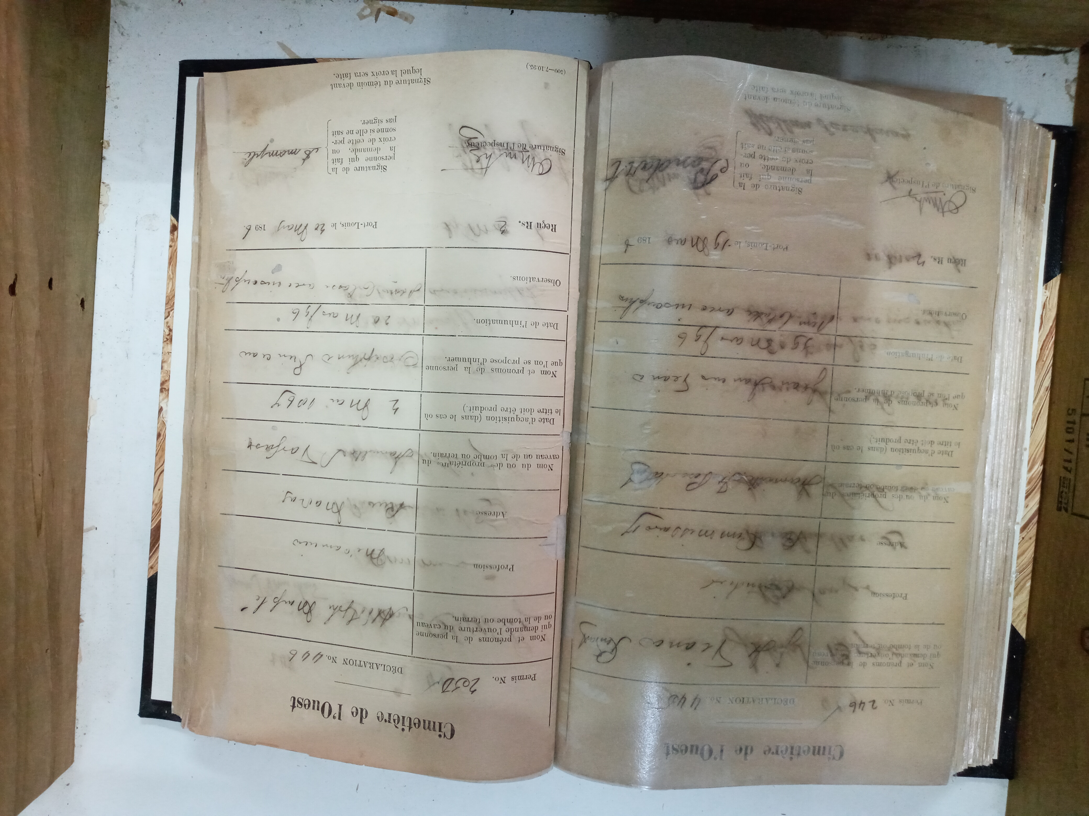 ci-dessous avec précaution. Les archives originales se trouvent dans le bureau de la Municipalité de Port Louis au Cimetière de l’Ouest. En cliquant sur les références photos, vous pouvez y accéder. Ces registres comprennent les Registres funéraires et l'Index des sépultures qui datent de 1890, et l'Index de section qui a été établi vers 1904/1905. Ils sont complétés par l'Index Ancien, un relevé de certaines pierres tombales.